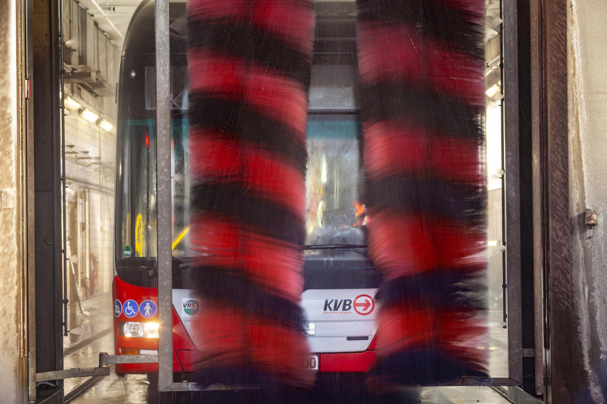 • → Auf den Bus-Betriebshöfen in Niehl und Porz werden wöchentlich mehr als 300 Busse in zwei Waschanlagen gereinigt.