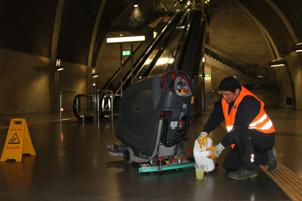 Bereichsleiter Herbert Schöneweiß öffnet einen Kanister, kniet sich auf den Boden und gießt vorsichtig eine gelblichtrübe Flüssigkeit in einen Messbecher. Er wirft einen prüfenden Blick auf die Skalierung und kippt das flockige Mittel in den 80 Liter Frischwasser fassenden Tank der Scheuersaugmaschine „Numatic“. „Die Dosierung ist genau auf die Bedürfnisse der Haltestellenreinigung abgestimmt worden“, sagt er und demonstriert die Wirkung der Wischmaschine. Denn für die Reinigung der U-Bahn-Haltestellen wird jetzt ein umweltfreundlicher Enzymreiniger genutzt, bei dem Mikroorganismen auch hartnäckigen Schmutz und damit einhergehende Gerüche beseitigen.