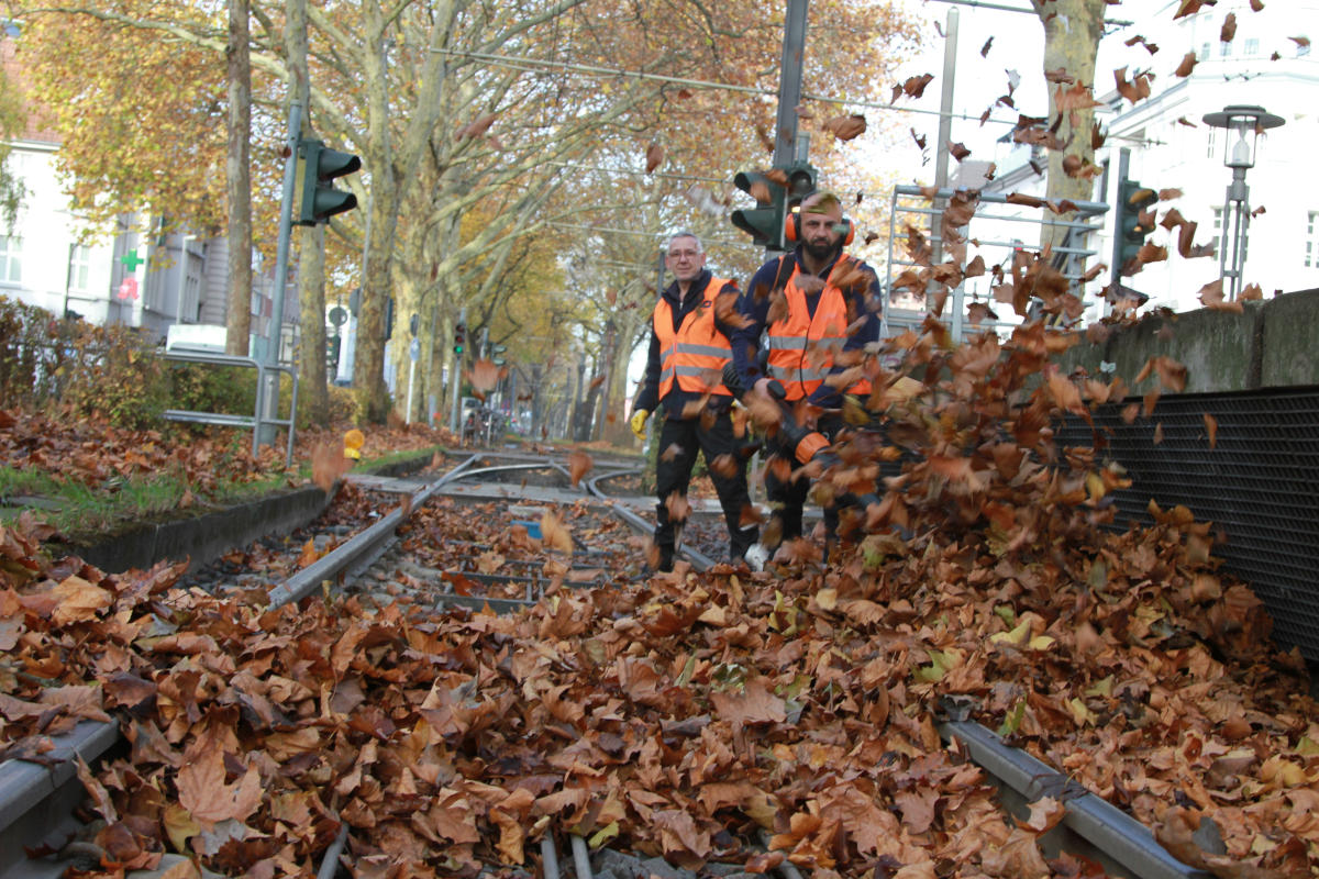 Laub wird auf den Gleisen entfernt