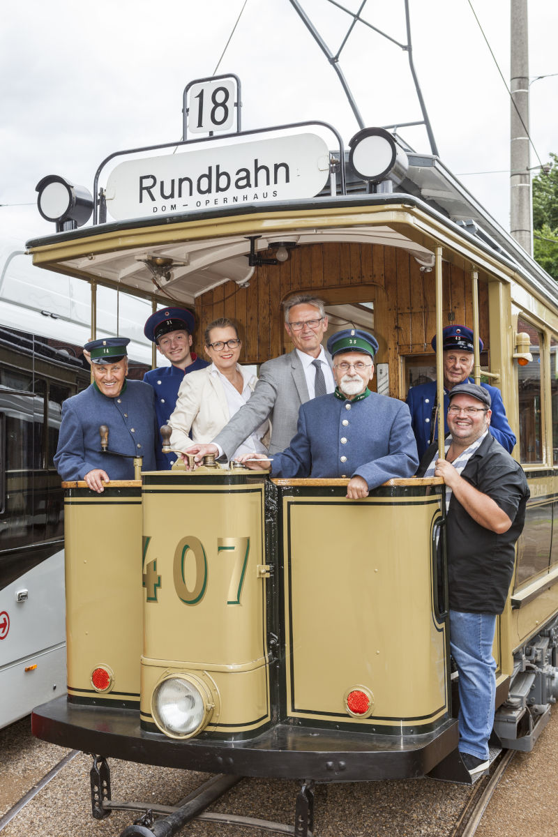 Björn Häuser und Mitarbeitende in historischen Kostumen zum 140. KVB-Jubuläum